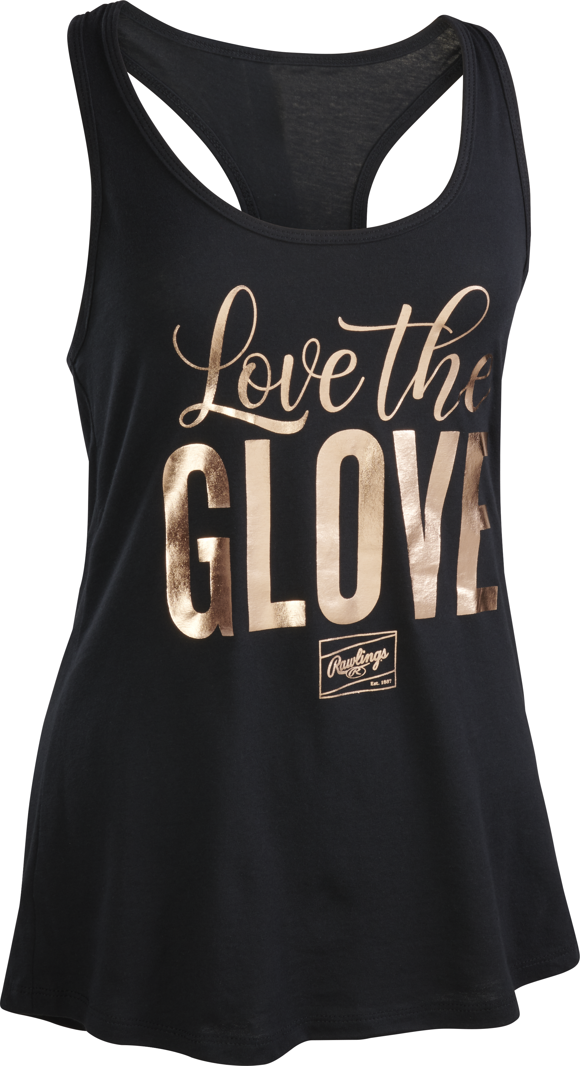 The Rawlings women’s Gold Standard tank top is perfect for any avid softball player or baseball mom to wear during the hot, summer days. The rose gold foil “Love the Glove” design offers a unique design to show off your love for the sport. Buy yours today!
